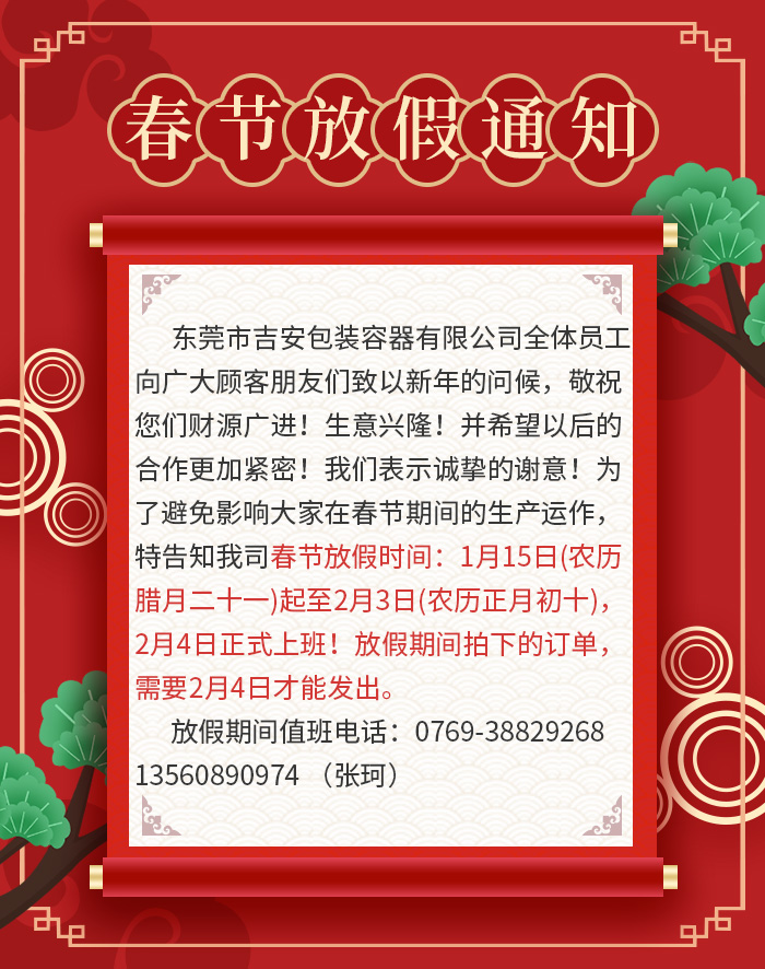 为了避免影响大家在春节期间的生产运作,特告知我司春节期间放假时间,: