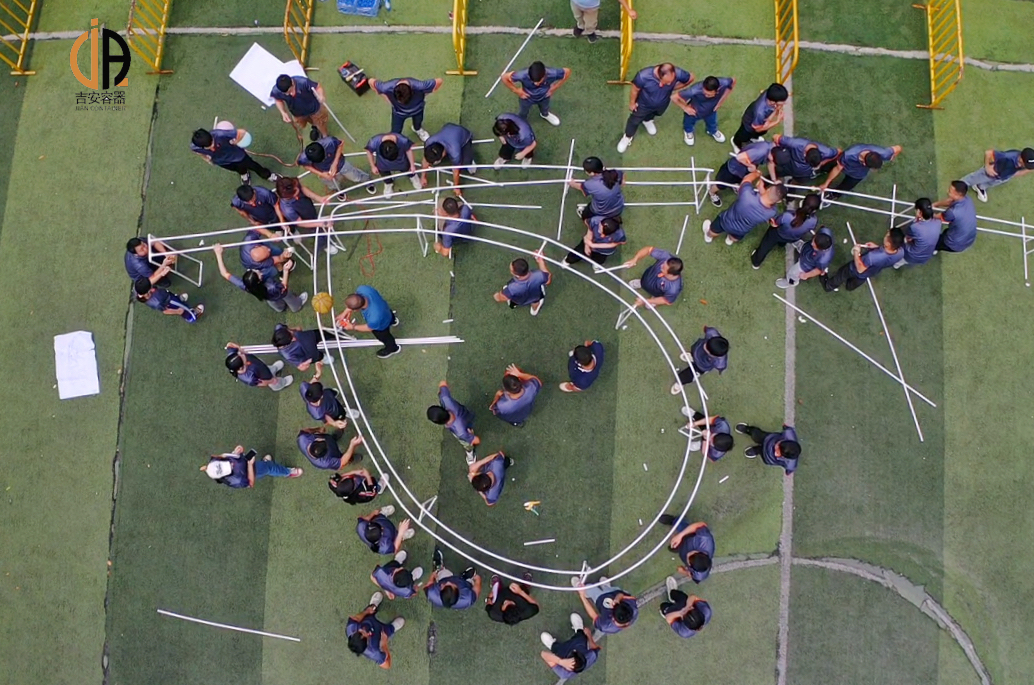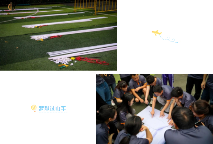 “梦想过山车”结合过山车的主题,来挑战每一位学员的决心和恒心。从智力、承受力、动手能力各方面给学员施加压力,与团队成员一起来设计和建造这个世界上最令人兴奋和最具创意的过山车。全队所有队员利用现有的道具搭建一个总长不少于10米高不小低于1.5米的过山车,且包含起点、直行、360度大循环、不少于一个的上坡及下坡、最后以不低于35公分为终点,要保证篮球从从起点最高点运行到最低处,且在中途球不可以跃出跑道。每组可以用官方提供的道具来分组拼装。